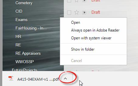 ایک بار جب آپ 'ڈاؤن لوڈ' بٹن پر کلک کریں گے تو منسلکہ آپ کے براؤزر کے نیچے رکھا جائے گا۔ تیر پر کلک کریں (فائل کا نام نہیں)، اور آپ کو فائل کھولنے کے اختیارات نظر آئیں گے۔