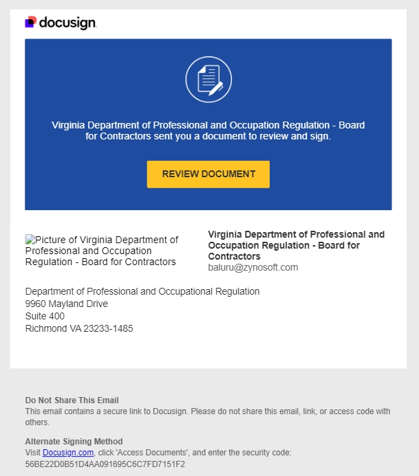 اپ ڈیٹ 11/8/2024: DPOR کو دھوکہ دہی پر مبنی DocuSign پیغامات کی متعدد رپورٹس موصول ہوئی ہیں جو DPOR کے بورڈ برائے کنٹریکٹرز سے ظاہر ہوتے ہیں (حوالہ تصویر دیکھیں)۔ اگر آپ کو یہ ای میل موصول ہوئی ہے، تو براہ کرم اسے حذف کر دیں، اس کا براہ راست جواب نہ دیں، اور پیغام میں کسی بھی لنک پر کلک نہ کریں۔ براہ کرم DPOR سے آنے والے کسی بھی پیغام کی تصدیق کے لیے نیچے دی گئی رہنمائی سے رجوع کریں۔ شک ہونے پر، ایجنسی کے مواصلات کی قانونی حیثیت کی تصدیق کے لیے ہم سے رابطہ کریں۔